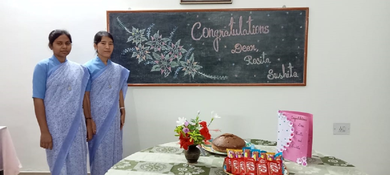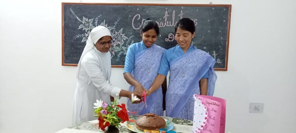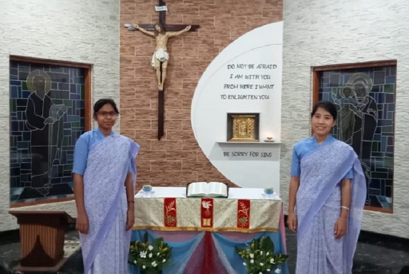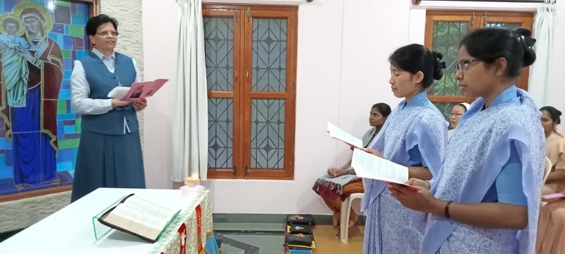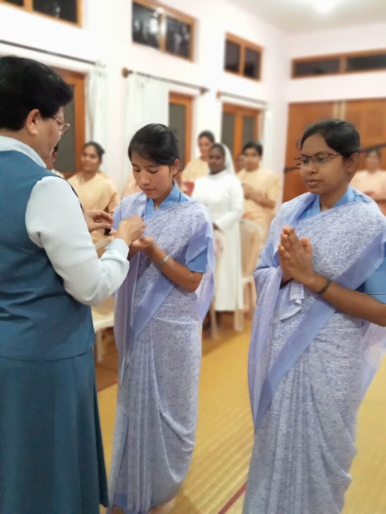 28 August 2021, the memorial of St Augustine Bishop and Doctor of the church, who having encountered Christ the Master gave himself totally in preaching God’s word and building up of His kingdom, the day’s Liturgy of the Word reminds us that “Faithfulness is not doing something right once, but doing something right over and over”. In Faithfulness and Joy responding to the Divine Master’s call two of our Postulants Rosita Gangmei and Sushita Kispotta took their first step into the Religious Life.