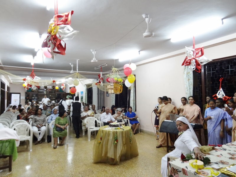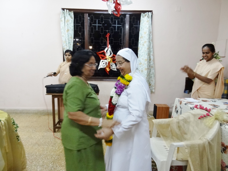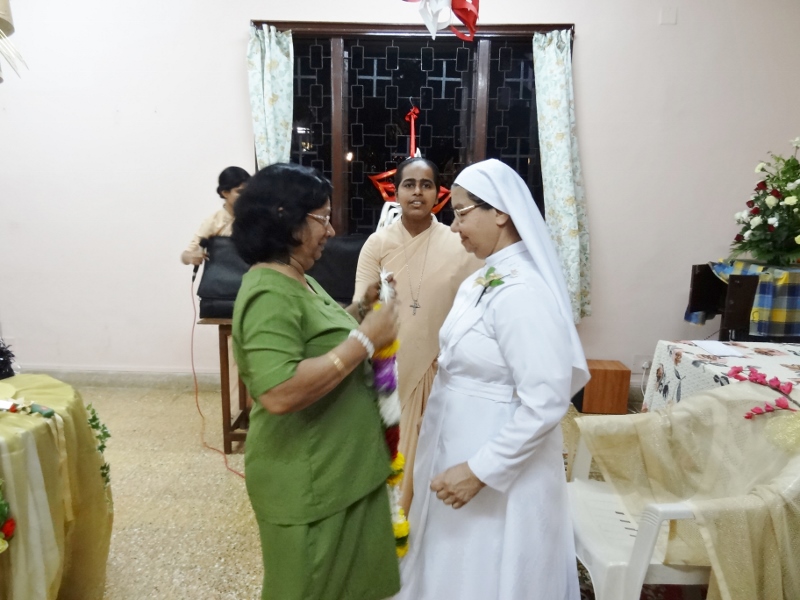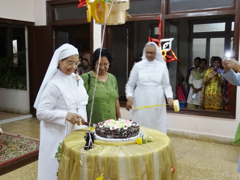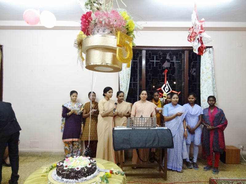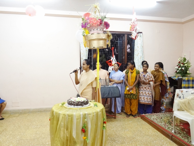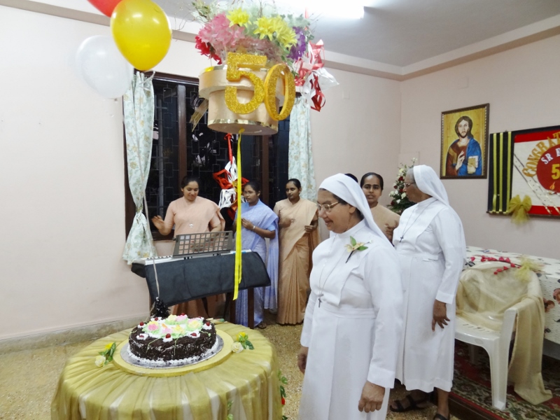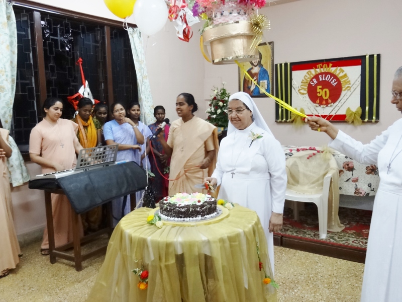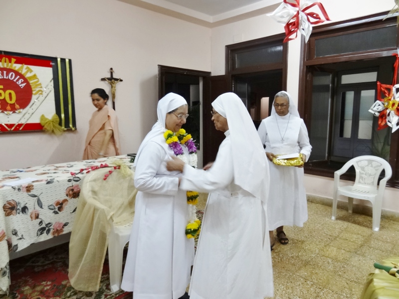 On 24th May, 2016, the Indian Province celebrated the Golden Jubilee celebration of Sr. Eloisa Menezes at Prarthanalaya, Community of Mumbai [the home town of Sr. Eloisa]. The Eucharsit began at 6.00 pm and was presided over by Rev. Fr. Clarence, the cousin brother of Sr. Eloisa. Fr. Jervis and Fr. Ashlyn who were also her cousin priests concelebrated the Eucharist. The occasion was hosted with the family and friends of Sr. Eloisa. On behalf of Sr. Rosemary the Provincial Superior, the Community Superior honoured and acknowledged the dedicated service of Sr. Eloisa by organising this solemn program. The Eucharist was followed by a felicitation program and a fellowship meal. May Jesus the Divine Master bless Sr. Eloisa with good health of mind, body and spirit as she continue with greater enthusiasm in her mission.