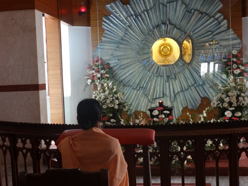 Apart from all other spiritual practices: Prayer of the Church, that is, Morning and Evening Prayer, we have perpetual Eucharistic Adoration.Where We represent the whole humanity before God. Round the clock there is always one sister Disciple before Jesus in the Eucharist presenting the needs of the entire world and giving company to Jesus who abides in the form of bread.